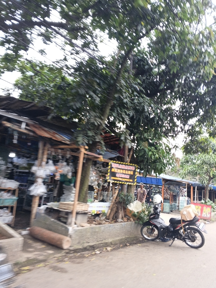 A street scene shows a roadside market under the shade of leafy trees. Small shops with cluttered displays sell various items. A sign in Indonesian is visible, "Dilarang Membuang Sampah". A motorbike is parked on the side of the road, carrying a container tied to the back. A person is visible walking near the shops. The day appears overcast.