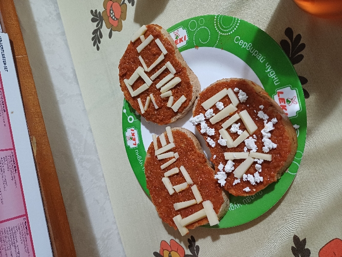 - "The scene depicts three pieces of bread, each topped with a reddish-brown spread and arranged on a circular white paper plate with a green rim" by FM-BPoag1, licensed under CC BY 4.0