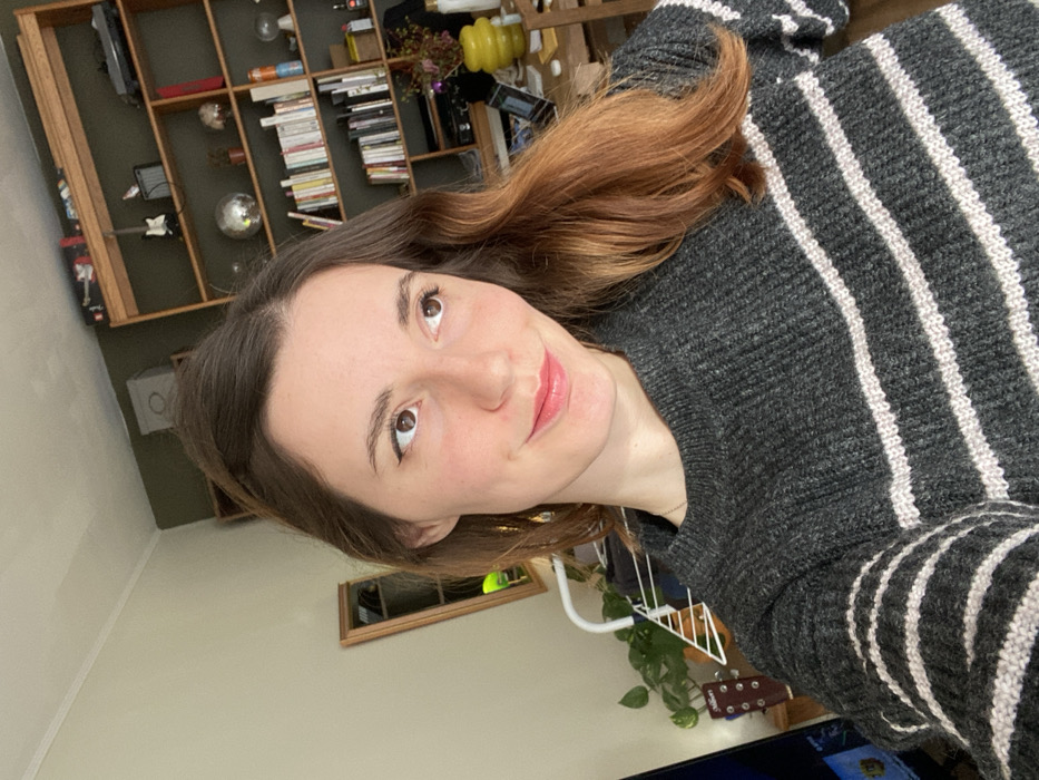 The image displays a female subject positioned in a residential interior, located in Lille, France. She has medium-length brown hair, with lighter, possibly auburn, tips and a slight wave. She wears a charcoal grey knitted sweater with three distinct horizontal white stripes across the torso and sleeves. Her head is angled slightly to her left, with her gaze directed upwards and to her left. Visible facial features include subtle eyeliner, pinkish-red lipstick, and a faint smile. Gold-colored earrings and a thin silver necklace are also apparent. The background on the left features a light beige wall, a narrow wooden-framed mirror reflecting green foliage and a bright light source, a white clothes drying rack, a green potted plant in a terracotta-colored pot, and a partial view of a television screen displaying a blue light, partially obscuring the headstock of an acoustic guitar. The background on the right reveals a dark olive green wall behind a tall, light wood-colored bookshelf. The shelves are densely populated with books, some vertically stacked and others horizontally arranged. Notable objects on the shelves include a miniature black electric guitar, a small silver disco ball, and various small decorative items. Below the bookshelf, a wooden desk is visible, holding an illuminated laptop, a distinctive yellow amorphous-shaped lamp, and a vase containing dried flowers. The scene is illuminated by ambient light.