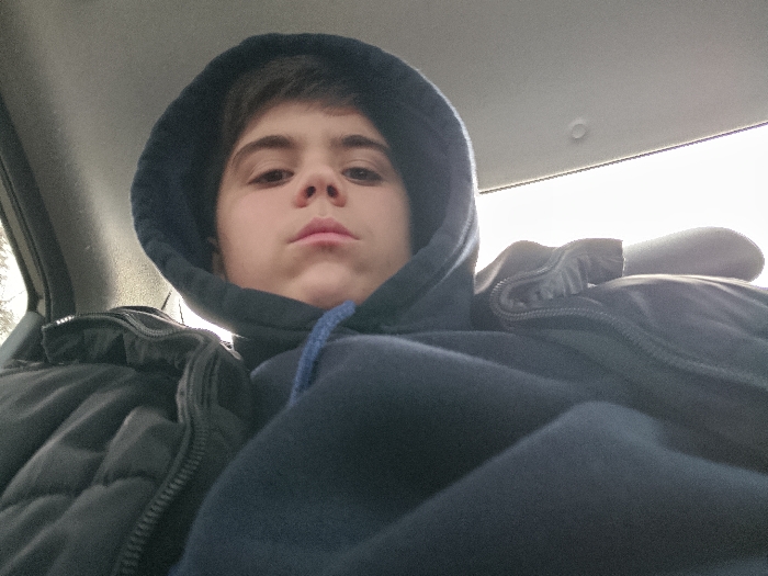 A young male individual, appearing adolescent, is depicted in a low-angle, close-up view from within a vehicle