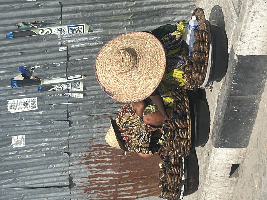 Two women wearing straw hats sit side-by-side, each with two baskets of goods beside them. The women wear patterned clothing. Behind them, a corrugated metal wall is adorned with paper and advertisements. The scene depicts a street vending setup.