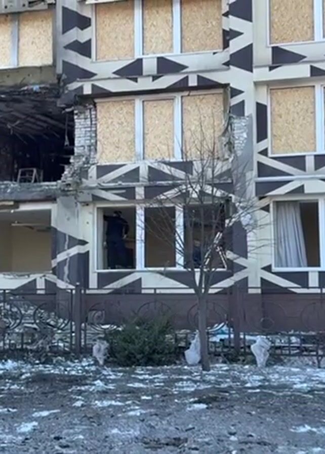 n exterior view of a multi-story building that has sustained significant damage. A large portion of the building's facade is missing, revealing the interior of multiple floors. The windows of the undamaged portions are covered with plywood. There are two individuals visible in a window, one wearing a dark garment and another standing on a ladder. A metal fence runs along the base of the building. The ground is covered in snow and debris. The building's exterior is patterned with a design of geometric shapes.