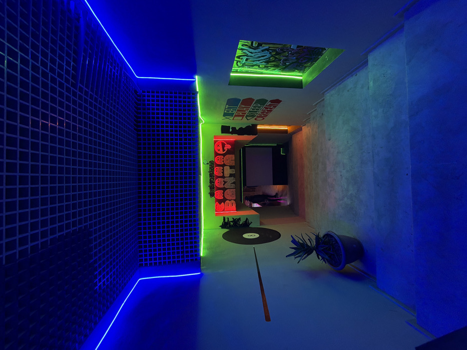 - "A neon-lit staircase descends into an entertainment venue in Meknes, Morocco" by FM-K4jhD2, licensed under CC BY 4.0