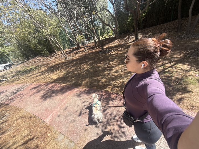 A woman is taking a selfie with her dog on a sunny day. She is wearing a purple top, black leggings, and white shoes. She has her hair in a bun and is wearing sunglasses and earphones. The dog is small and furry, walking to the left. They are on a red brick walkway with trees and green foliage in the background, where there's also a parked car. Shadows from the trees are visible on the path.
