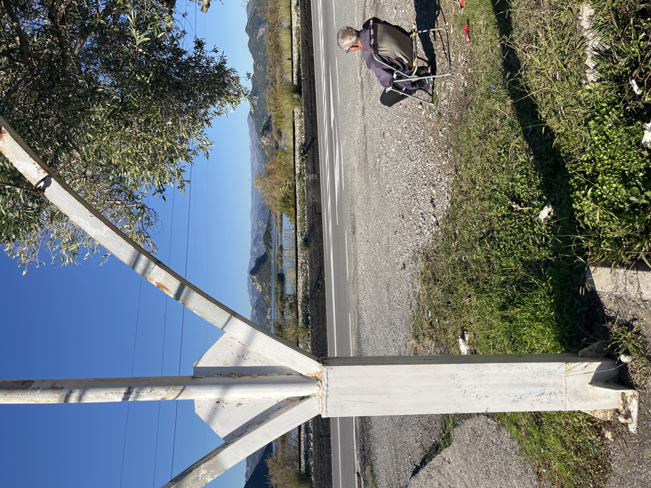 This image depicts a rural roadside scene in Vranjina, Montenegro, under a clear blue sky. In the immediate foreground, to the left, a weathered white painted metal structure, possibly a support for an overhead sign or utility, is partially visible. It features a vertical rectangular base column connected to an upper V-shaped or inverted A-frame element with an arched top bar extending out of frame to the right. Rusting and chipped paint are visible on its surfaces. The ground directly beneath and around this structure consists of green grass and weeds, interspersed with some litter. To the right of the metal structure, a dark-haired individual, appearing to be an elderly male, is seated in a beige-colored portable folding chair on a gravel shoulder next to a paved road. He is seen from behind, facing away from the camera, and is wearing a dark purple long-sleeved shirt and dark trousers. His hands are resting on his lap. To his immediate right, on the gravel, a red object, possibly a discarded can or wrapper, is visible. The paved road features white double solid lines and an arrow marking indicating a straight direction. Beyond the road, approximately 10-15 meters distant, a set of train tracks runs parallel to the road. Further beyond the tracks, a body of water, likely a lake or wide river, is visible, reflecting the sky. Scattered small, marshy islands with sparse vegetation are present in the water. In the distant background, a range of irregular, low-lying mountains or hills with varying shades of green and brown foliage stretch across the horizon under the bright blue sky. An olive tree with green leaves casts shadows on the right side of the image, partially obscuring the upper right corner.