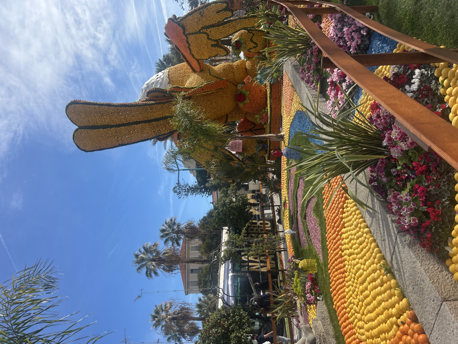 This daytime image captures an outdoor festival scene in Menton, France, under a clear blue sky with scattered cirrus clouds