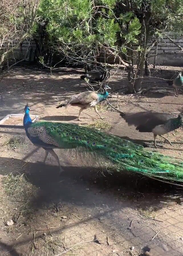 group of peacocks walking around in an enclosure. There is a male peacock with a long, colorful train of feathers and several peahens with less vibrant plumage. The enclosure appears to be a dirt area with some vegetation and a wire fence. There is a feeding dish visible in the background. The peacocks are walking and foraging on the ground. The camera pans slightly, following the movement of the peacocks.