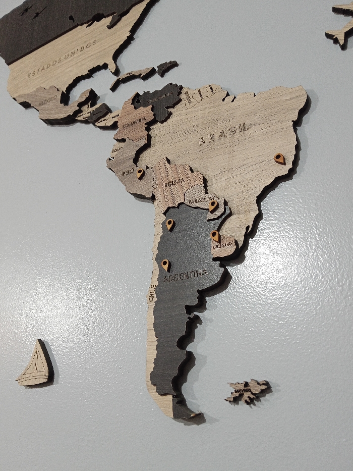 A wooden map of South America and parts of North America is mounted on a gray surface