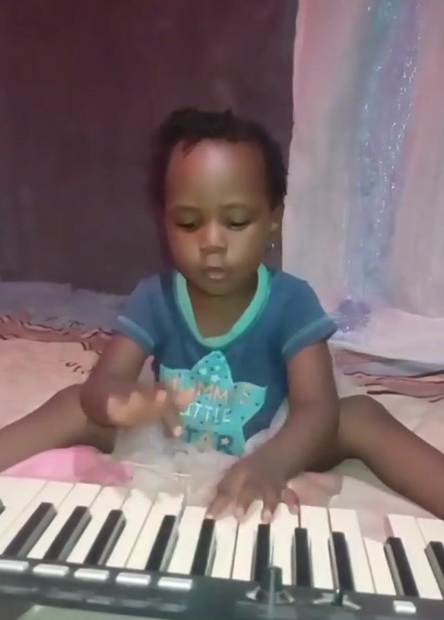 A young child sits cross-legged on a bed, playing a black and white keyboard. The child is wearing a blue t-shirt with a star on it, and a white tutu. The background has a gray sheet on one side and a white curtain with a glittery design on the other. The child presses the keys with their fingers.