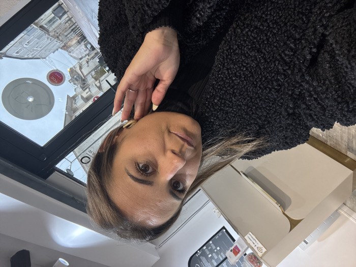 A female individual is depicted in a close-up, selfie-style photograph taken indoors. She has medium-brown hair, brown eyes, and is wearing a black textured jacket over a black turtleneck. A gold-colored hoop earring is visible on her right ear, and a metallic ring is present on her left ring finger. Her left hand is raised with fingers splayed, positioned near her right ear, as if touching or adjusting the earring. She gazes directly at the camera with a neutral expression. The indoor environment behind her includes a light-colored counter with a gold-colored metallic trim, a clear container holding red candies or small items, and a sign displaying a Wi-Fi symbol and text. A dark menu board with white text is mounted on the wall above the counter. Recessed light fixtures are visible on the ceiling. To the right of the subject, a large window reflects an exterior street scene typical of a European town. The reflection shows multiple multi-story buildings with traditional architecture lining a street, under what appears to be an overcast sky. Several decals are affixed to the window, including a circular one with "TCC" and "2023" printed on it. This scene is located within a commercial establishment in Andrézieux-Bouthéon, France.