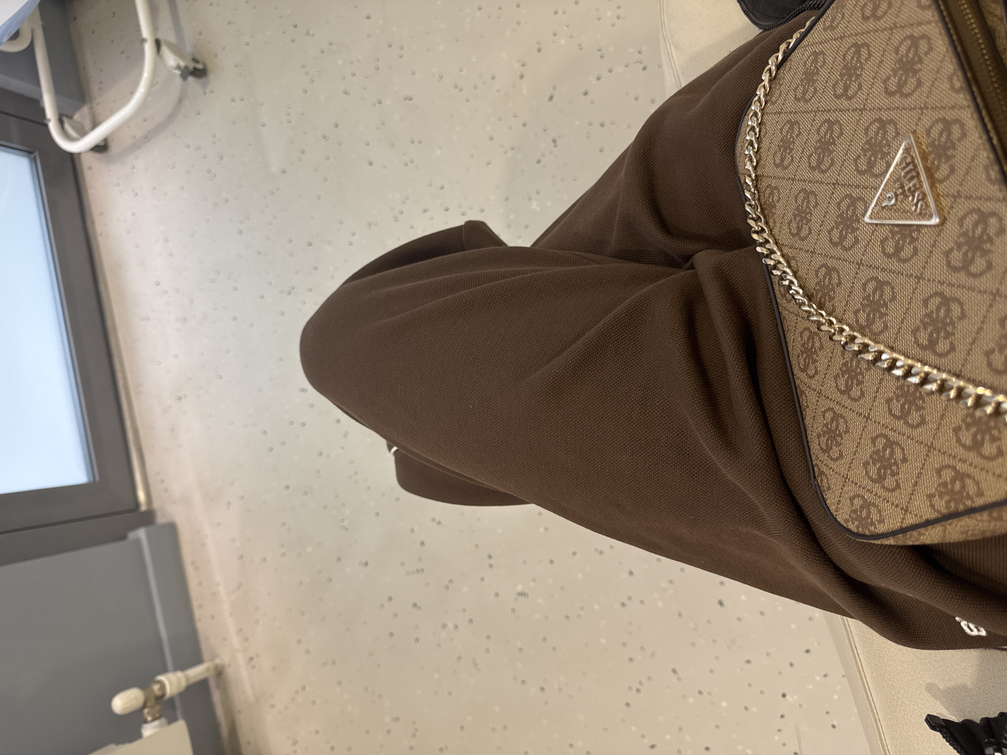 The image depicts a person seated, likely indoors, wearing brown clothing and carrying a Guess brand handbag