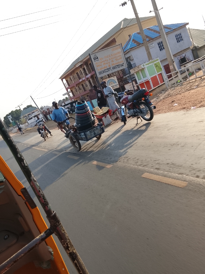 A partially visible three-wheeled vehicle moves along a paved road, displaying a weathered yellow exterior and a simple metal frame. Ahead, a man rides a bicycle pulling a trailer loaded with stacked tires. Further down the road, another motorcycle travels in the same direction. Buildings with multiple floors and varying roof designs line the roadside. A sign with numbers is visible near the buildings. The overall scene depicts a busy street with various forms of transportation.
