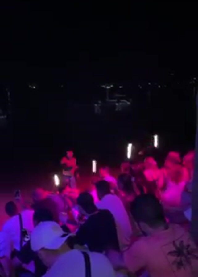 A fire dancer performs for a small crowd on a beach at night. The dancer, shirtless and wearing shorts, twirls flaming torches, with the light reflecting on the nearby water. The crowd is a mix of people facing the dancer, many holding up phones to record the performance. The scene is lit with both the fire from the torches and additional pink and purple stage lighting. The background includes a dark body of water with distant lights.