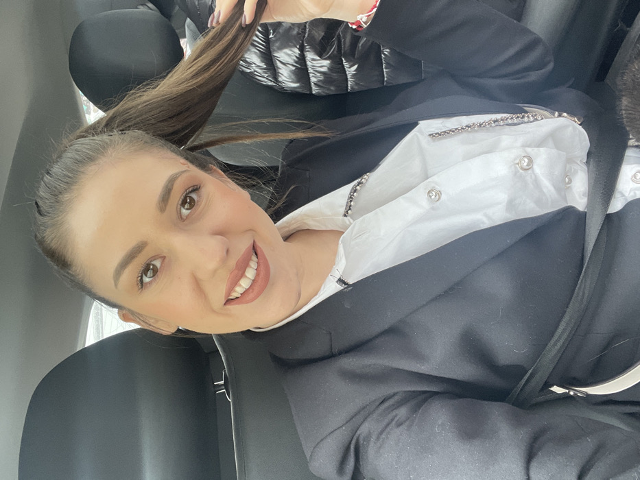 A female subject is depicted in a close-up, selfie-style photograph taken inside a vehicle, located in Sofia, Bulgaria. She has fair skin, brown eyes, and light brown hair styled in a high ponytail, with strands held by her right hand. Her facial features include light makeup with light brown lipstick, and she is smiling, showing her upper teeth. Her visible right hand displays light purple-grey painted fingernails. A red and white string bracelet is present on her right wrist. She is wearing a black blazer over a white button-up shirt that features silver buttons and a decorative silver chain along the placket. A black seatbelt crosses her chest and shoulder. A dark headrest is visible behind her. To her right, a black quilted puffer jacket is present on an adjacent seat. The exterior background visible through the window is out of focus and indistinct.