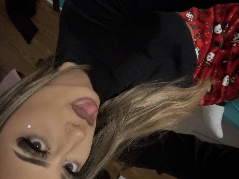 A woman with long blonde hair, dark eye makeup, and lip liner is sticking out her tongue. She has a face piercing near her left eye and a nose piercing. She is wearing a black top, and what appears to be pajama pants with a Hello Kitty pattern are visible. A fluffy white sock can be seen in the lower right corner. The background is blurred, and there is a wooden floor visible in the top left. The image is angled, with the woman's face close to the camera.