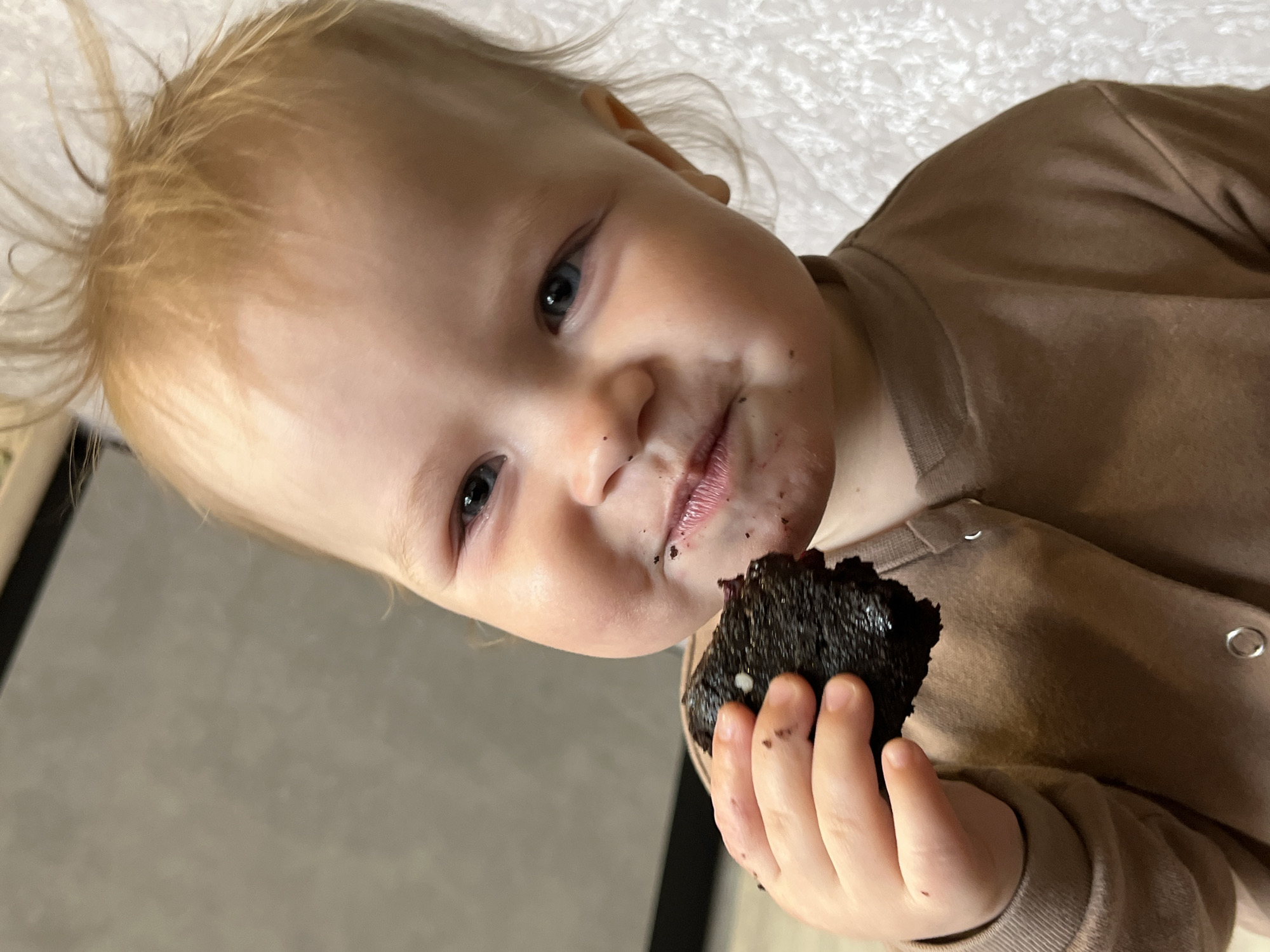 - "A fair-skinned toddler with blonde hair and blue eyes is holding a dark brown baked good, possibly a brownie or chocolate cake" by FM-MbhEM2, licensed under CC BY 4.0