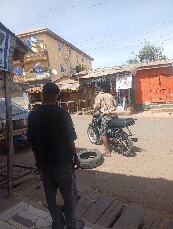 The image depicts an outdoor street scene in Jos, Nigeria, under clear daylight. In the foreground, a male individual stands with his back to the camera, wearing a dark short-sleeved shirt and dark trousers. He is positioned on a raised, uneven surface composed of light-colored tiles and dark wooden planks. To his immediate right, a dark blue vehicle's rear is partially visible. A black car tire lies flat on the unpaved ground in the mid-foreground. Further into the midground, a male individual is seated on a black motorcycle, facing away from the camera. He wears a light-colored plaid shirt and patterned shorts, with flip-flops on his feet. The motorcycle has chrome wheel rims and a black seat. The ground surface is a mix of unpaved dirt and darker asphalt. To the right of the scene, two single-story commercial structures with corrugated metal roofs are visible. The structure on the far right is painted orange-red with large, closed double doors. Adjacent to it, a stall displays various goods under its roof, and a sign reading "Ricky World" and "POS" is affixed to its front. In the background, a multi-story residential building, light brown in color, features multiple blue-framed windows, balconies with dark railings, and several satellite dishes. A clear blue sky with overhead power lines occupies the upper portion of the image. Green foliage from a tree is visible between the background building and the commercial stalls. Strong shadows indicate direct sunlight.