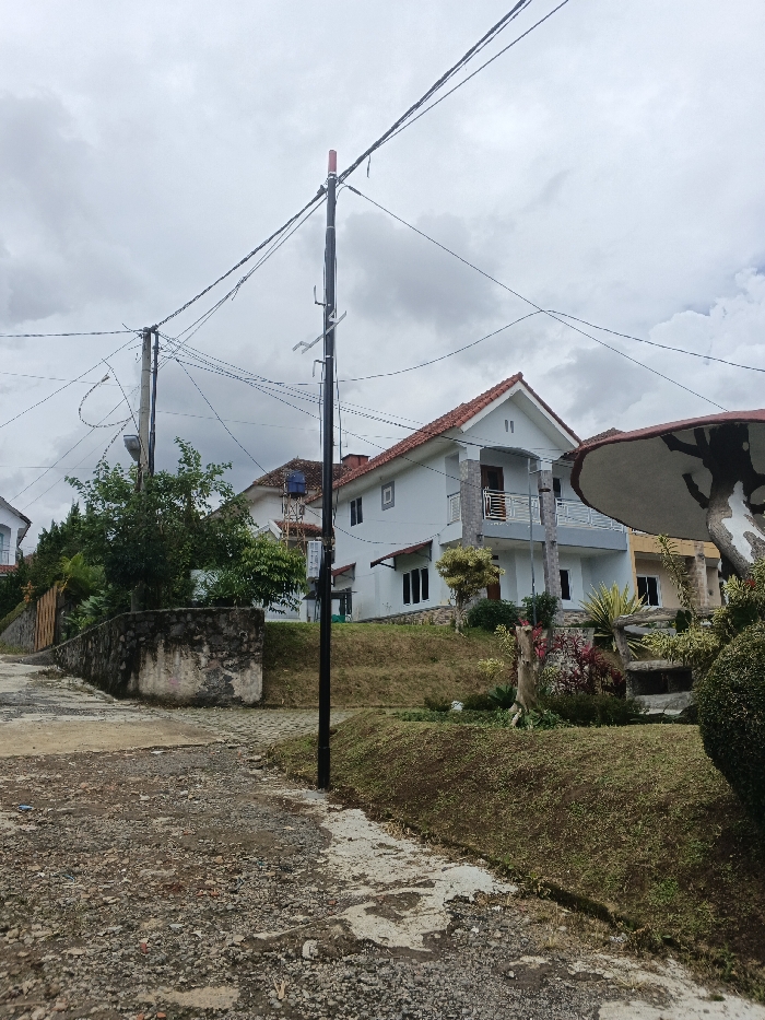 The image depicts a residential street scene in the city of Unknown, Vietnam, under an overcast sky. In the immediate foreground, a rough dirt and gravel path occupies the left side, transitioning to a cracked concrete surface on the right. A black utility pole stands prominently in the center foreground, equipped with several white, angular insulators and topped with a red finial. Numerous black electrical and communication wires extend in various directions from this pole and an older, grey utility pole further back on the left, which also supports a streetlight fixture. To the left of the path, a weathered stone retaining wall is visible. In the midground, a two-story white house with a reddish-orange tiled gable roof is situated on a grassy slope to the right. This house features a second-floor balcony with light-colored railings, dark-framed windows, and a brown front door. Behind it and slightly to the left, another house with a dark tiled roof is partially visible, featuring a blue water tank mounted on a metal frame. The grassy slope on the right side of the frame includes landscaped vegetation, such as bushes and small trees, along with various decorative elements including stone features and an abstract, mushroom-shaped garden ornament. No individuals are present in the scene.