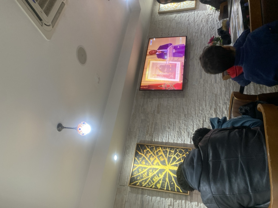 A low-angle shot captures the interior of a room with a textured, light-colored brick wall. A television displays a broadcast featuring a person on a stage, and below it, a framed artwork depicts a golden, radiating design. A wall sconce with a patterned glass shade is visible on the ceiling, along with a circular ceiling speaker and an air conditioning vent. People are sitting in chairs, with their backs turned towards the camera.