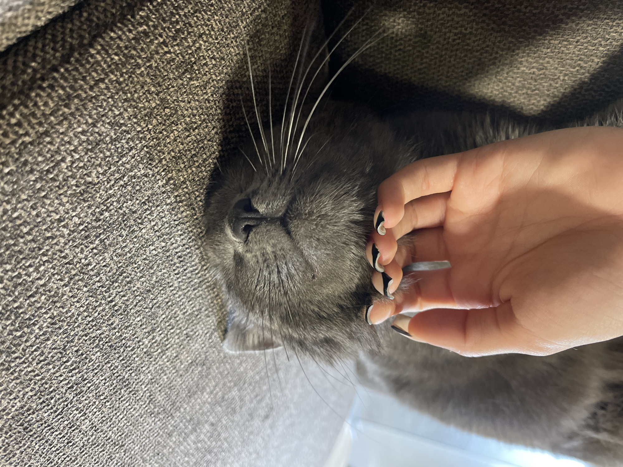 A gray cat lies on a gray, textured surface, possibly a couch or bed. A hand with black and white nail polish rests on the cat. The location is unknown and unidentifiable.