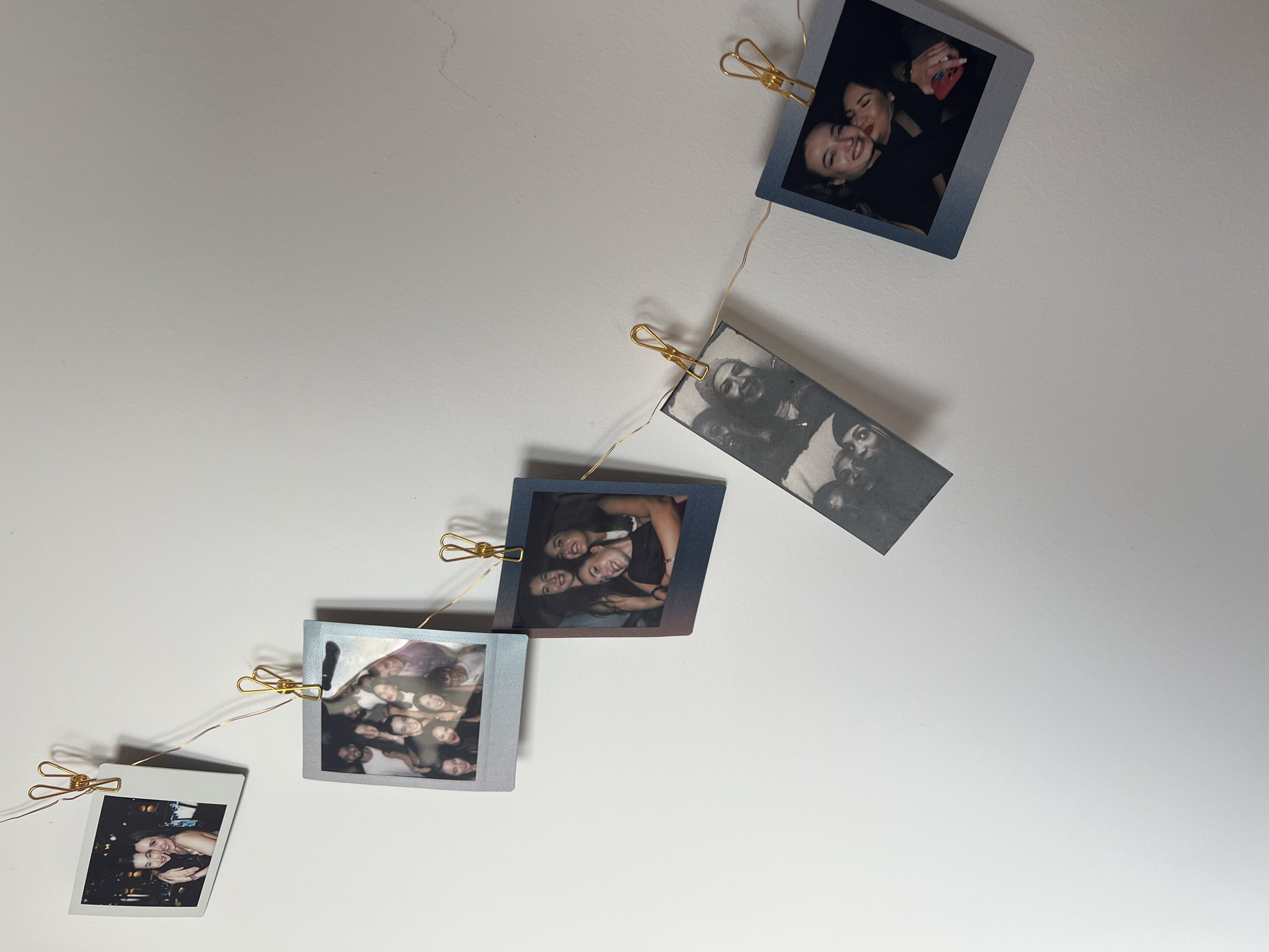 series of five instant photographs hung on a thin, possibly copper-colored wire against a white wall