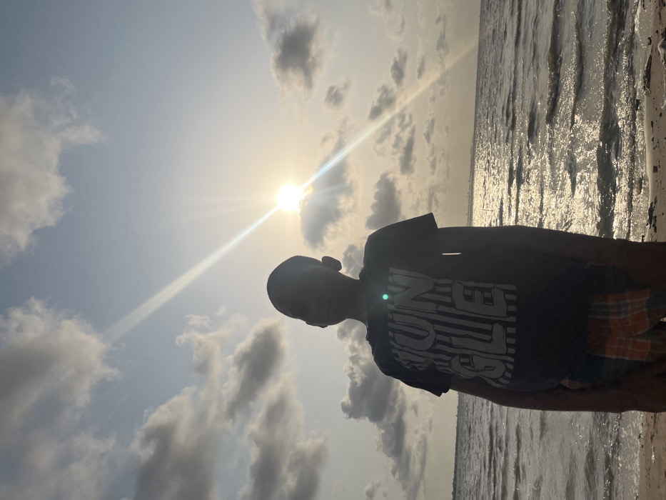 A child stands on a beach with the ocean waves visible in the background. The sun is bright and slightly obscured by clouds in the sky, casting a glare. The child is wearing a dark t-shirt with a graphic design on it and patterned shorts. The scene appears to be a sunny day at the beach, captured with a low camera angle. The image is rotated 90 degrees clockwise.