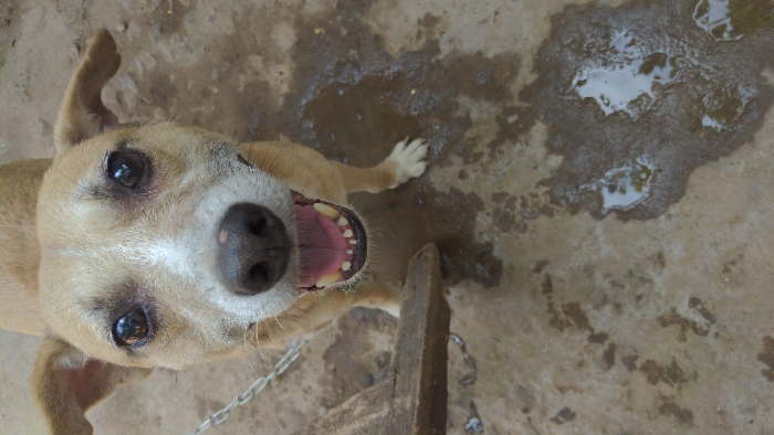 A tan and white mixed-breed dog stands on a concrete or packed dirt surface in Moshi, Tanzania, positioned centrally and looking directly at the camera. The dog has prominent dark eyes, a dark nose with a small pink lesion, and floppy ears. Its mouth is open, revealing a pink tongue and its lower incisors and canines. A metal chain is visible extending from the dog's neck towards the left side of the frame. A piece of dark, worn wood is partially visible on the ground in the lower-left quadrant. The ground beneath the dog and in the foreground is uneven, with multiple dark, irregular wet patches and small puddles reflecting the overhead light.