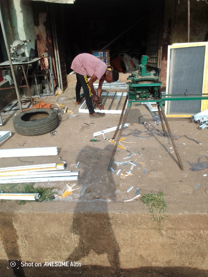 A man works on a metal frame with a drill, next to a green metal tool stand. Aluminum frame pieces and scraps litter the ground. A car tire sits to the left, and finished window frames are visible to the right. The scene appears to be an outdoor workshop adjacent to a building with peeling paint and an open door.