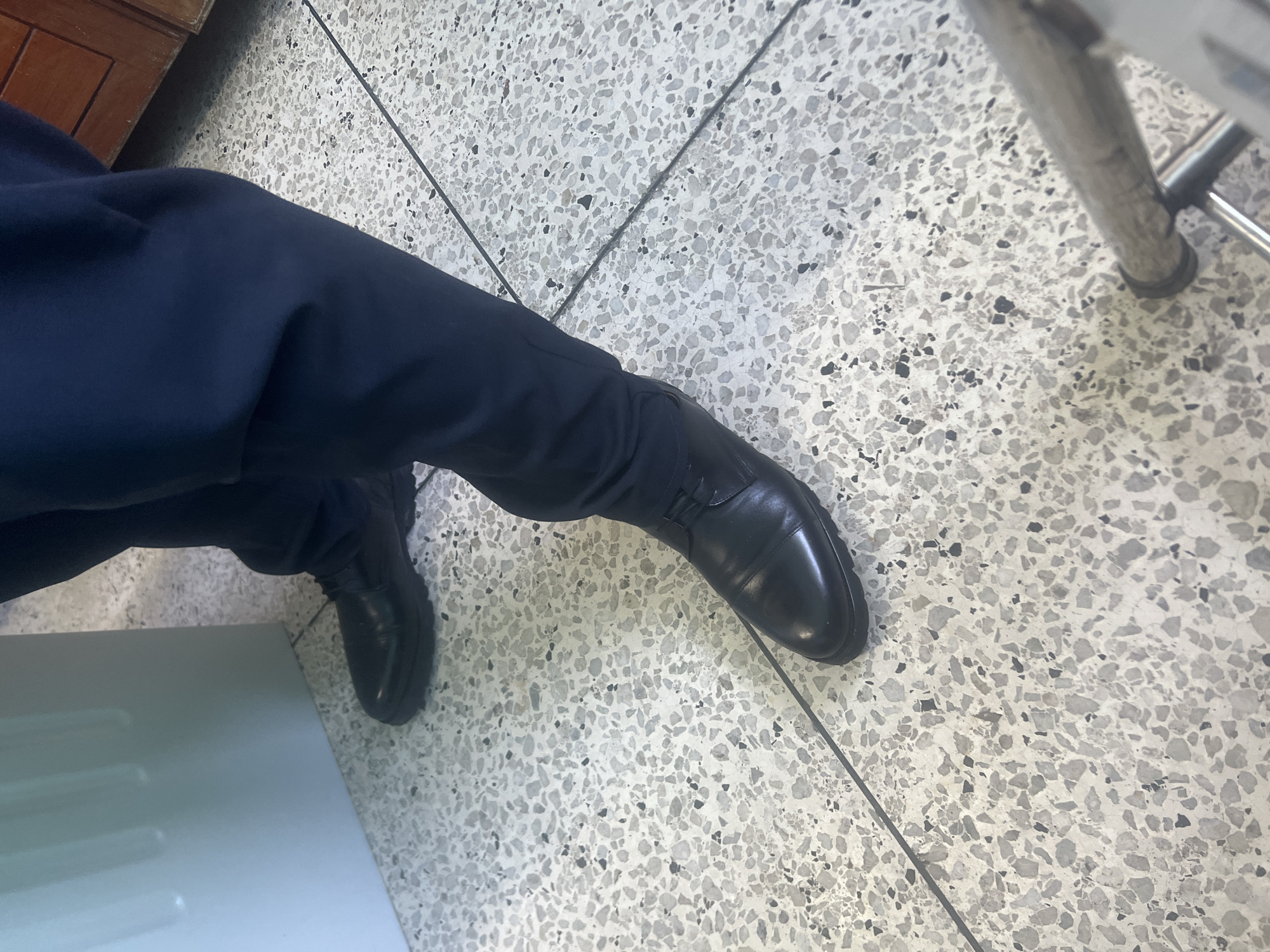 The image captures an indoor scene in Dar es-Salaam, Tanzania, focusing on the lower legs and feet of one individual. The person is wearing dark blue trousers and polished black leather lace-up shoes with relatively thick soles. They are standing on a light grey terrazzo floor featuring irregular dark grey, black, and white aggregate, with thin dark lines indicating tile joints. To the immediate left, a portion of a smooth, light-colored vertical surface is visible. In the upper right background, a segment of dark brown wooden furniture or paneling is partially discernible. A metallic leg, likely from a chair or table, with a black rubber foot, occupies the lower right foreground.