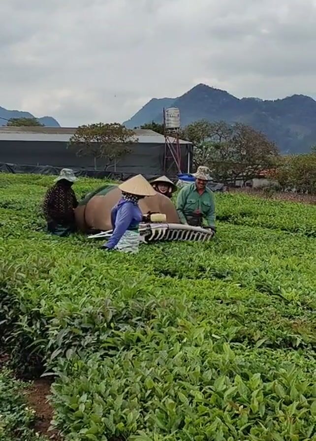 three people harvesting tea leaves in a field. Two people wear conical hats, while the third wears a wide-brimmed hat. One of the people is using a mechanized harvester to cut the tea leaves, while the other two are gathering the leaves. The tea field is surrounded by mountains and trees, and there is a building in the background. The sky is cloudy.