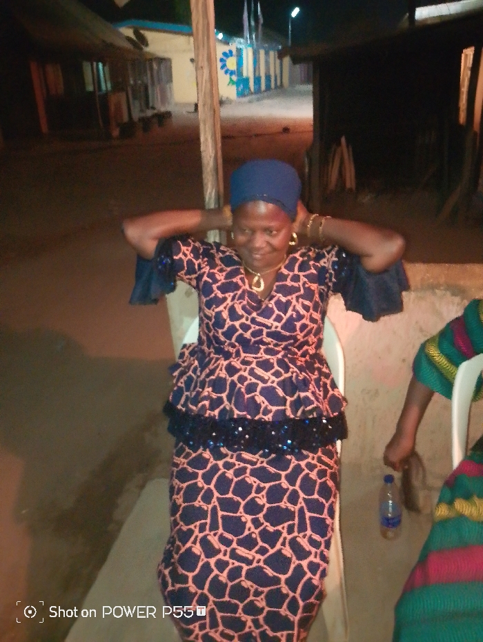A mature woman is seated outdoors at night, wearing a blue headwrap and a patterned, fitted dress with a sequined waistline. She has both hands behind her head. Her dress has a blue and pink jagged pattern. She wears a gold necklace, earrings, and bracelets. Another person sits nearby, holding a water bottle. Buildings are visible in the background, dimly lit. A pole stands behind the woman. The scene is captured with a mobile device.