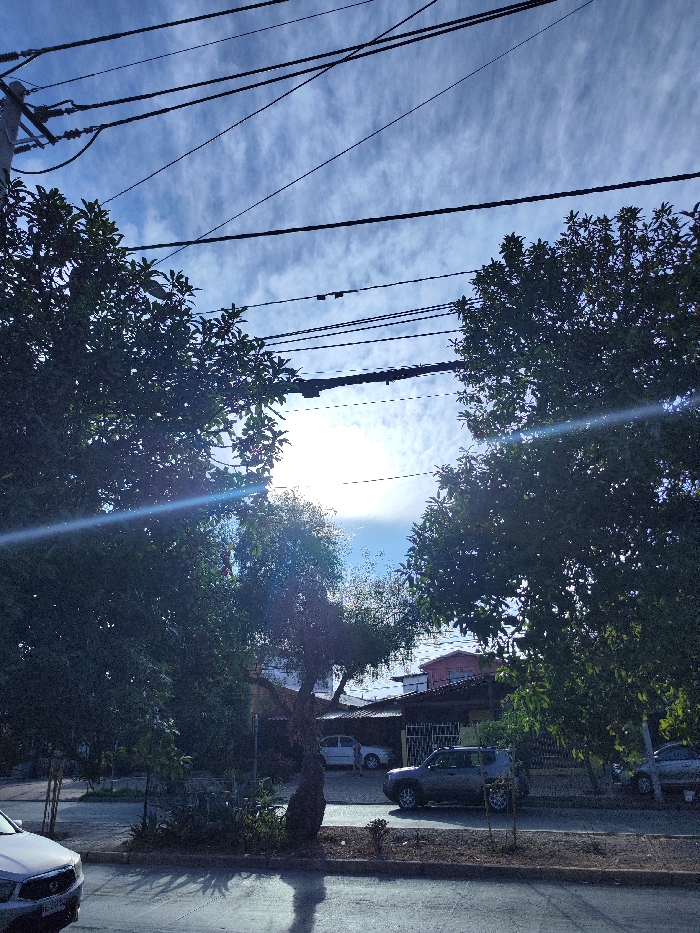 A daytime street view features trees framing the sky, partially obscuring the sun. Power lines stretch across the sky. Vehicles are parked along the side of the street in front of residential houses. The sky is blue with wispy clouds. The sun is bright and creates a glare.
