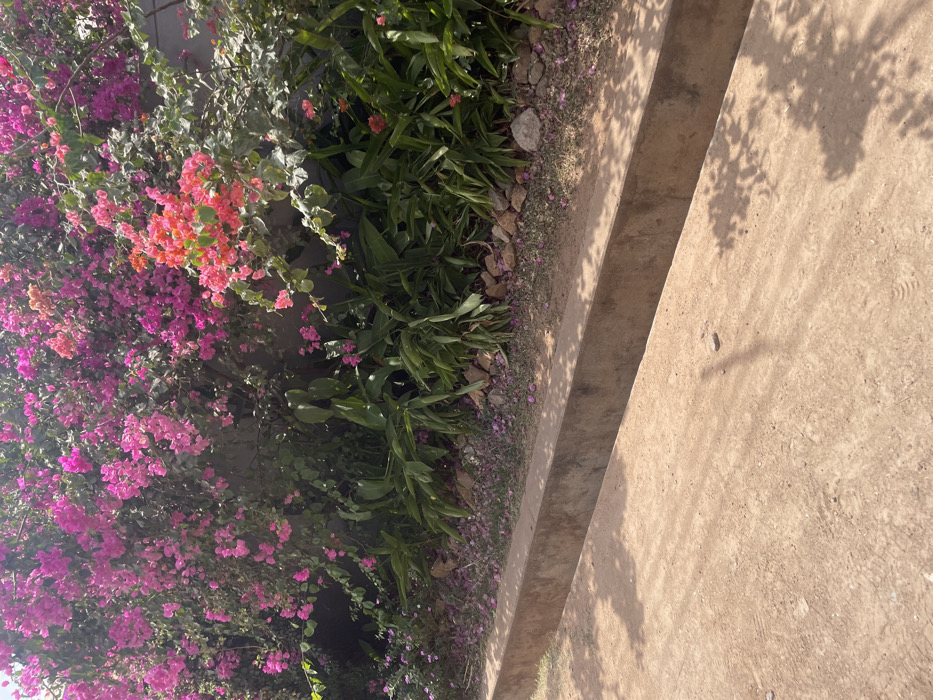 This image captures a section of a street or pathway in Unguwar Rimi, Nigeria, under bright daylight. The foreground consists of a light brown, unpaved ground, possibly dirt or sand, showing minor textural variations and scattered shadows from overhead foliage. A rectangular concrete drainage channel or gutter runs horizontally across the mid-ground, separating the unpaved path from a raised planting area. This planting area features dense green foliage, including larger-leafed plants and smaller shrubbery, with numerous scattered pink and purple petals on the ground. Several light-colored rocks are interspersed within the planting bed. The background is dominated by a vibrant wall of flowering plants, primarily bougainvillea, displaying a dense profusion of fuchsia and pink blossoms, with some clusters of orange or coral-colored flowers. Green leaves are visible among the flowers, and a darker wall or structure is partially obscured behind the foliage. No individuals are present in the scene.