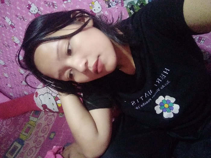 A young woman with dark hair wearing a black t-shirt is angled towards the camera, resting her head on her hand. The t-shirt features a white flower design. She has fair skin and appears to be looking down. The background consists of a pink wall and bedspread covered in Hello Kitty patterns. The lighting is soft, giving the image a relaxed and slightly blurred effect.