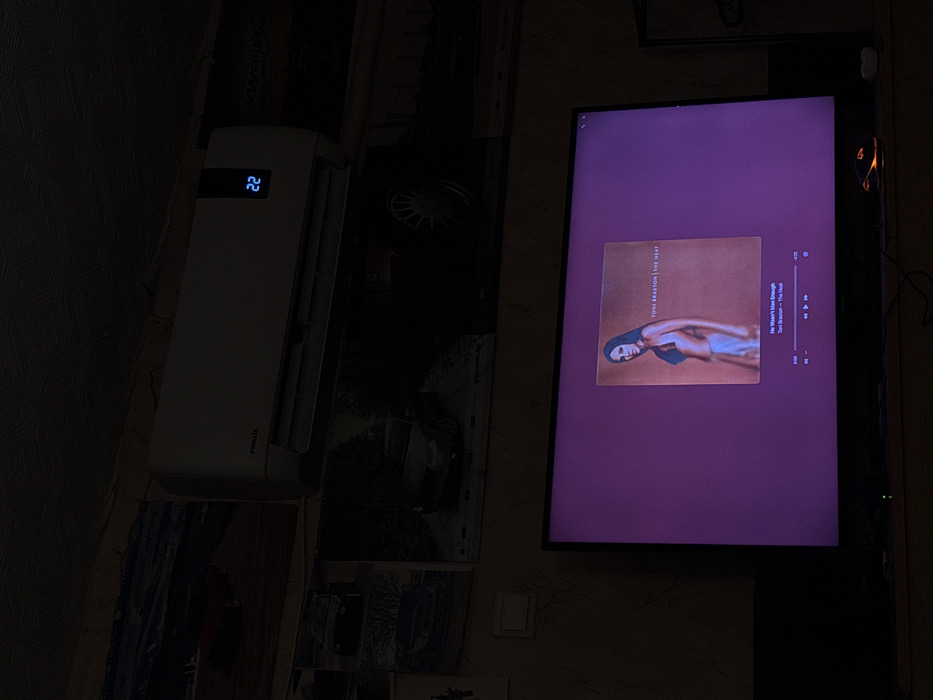 This image depicts a dimly lit indoor environment, identified as a room within Varbak, Bulgaria. Positioned high on a textured wall is a white FINLUX split-system air conditioner, displaying the temperature "22" in blue digital numerals. Directly below the air conditioner, a black-framed flat-screen television is active, showcasing a music player interface. The screen prominently features album art for Toni Braxton's album "The Heat," with the track "He Wasn't Man Enough" by Toni Braxton also displayed alongside music playback controls. The wall space surrounding and above the television and air conditioner is adorned with several dark posters or prints, predominantly featuring various automobiles, including a partial "VW Club" emblem visible on the right side. On the surface immediately in front of and below the television, a gaming mouse with orange illuminated accents is situated on the right, next to a small, circular white object. No individuals are present within the scene, which is primarily illuminated by the light emanating from the television screen and the air conditioner's digital display.