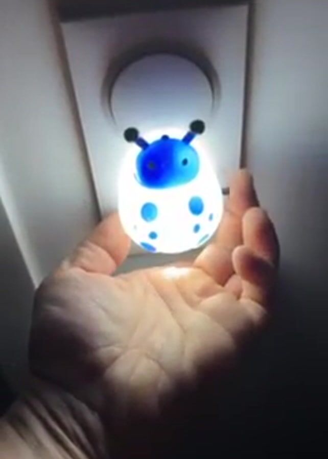 A hand is shown reaching for and activating a night light that is plugged into a wall outlet. The night light is shaped like a ladybug with blue spots and antennae. It emits a bright white light. The hand then moves away from the light, allowing it to illuminate the surrounding area.