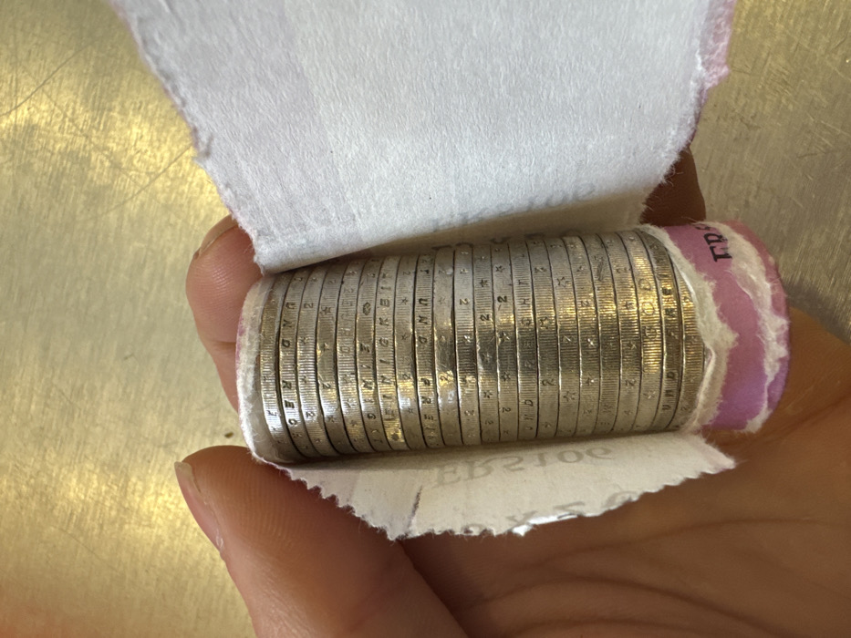 - "A close-up, top-down forensic image captures a human left hand holding a partially unwrapped roll of Euro coins, set in Vincennes, France" by FM-y5OoI2, licensed under CC BY 4.0