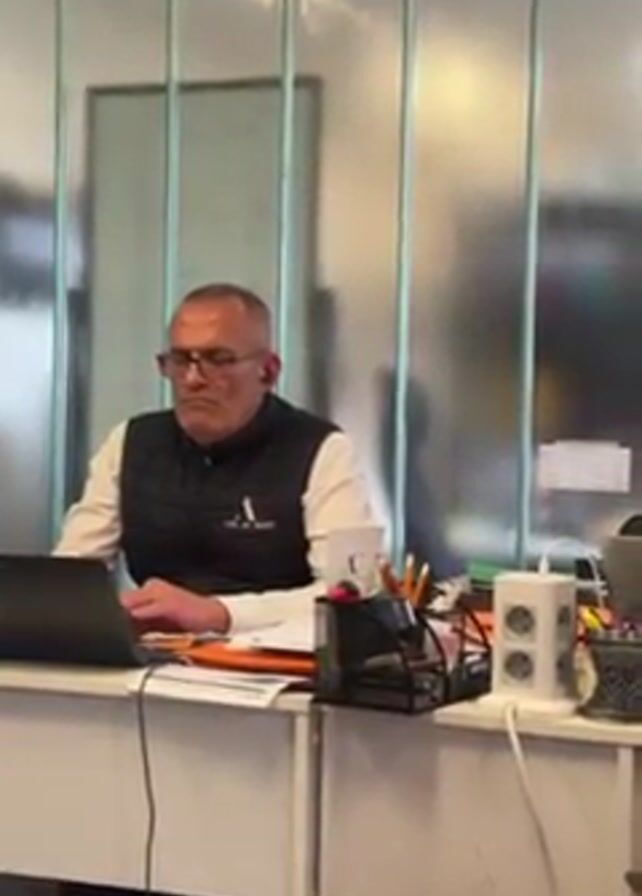 A middle-aged man is sitting at an office desk using a laptop. He is wearing glasses, a white shirt, and a black vest with a logo on the chest. There are papers, pens, and a power outlet cube on the desk. The office has a frosted glass partition behind him. He appears to be typing and concentrating on the laptop screen.