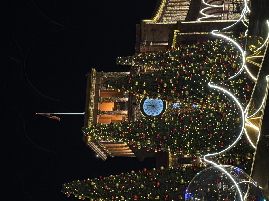 A nighttime scene features a tall, decorated Christmas tree with red and gold ornaments, interspersed with string lights. The tree obscures part of a building with a large clock. A flag is visible atop the building, slightly blurred in the dark sky. White, curved light structures are situated near the tree, and a spherical object with lights is at the bottom. The overall image is vertically oriented and has a festive atmosphere.