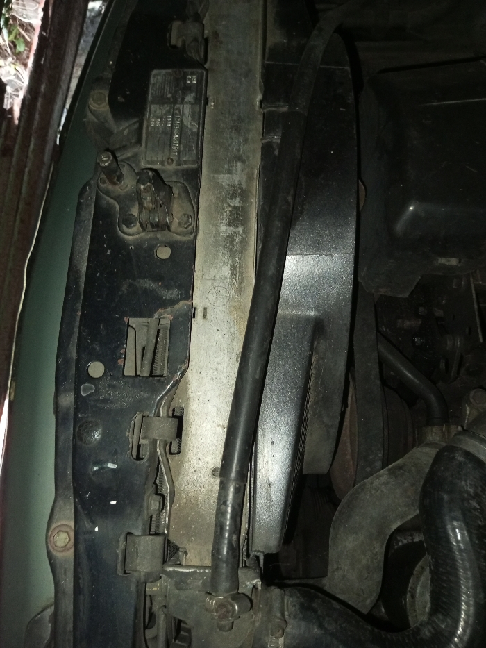 The image displays a portion of a vehicle's engine compartment, focusing on the radiator area. A black hose with a clamp is visible, running alongside the radiator. The radiator itself appears silver and metallic. To the left is a black frame with mounting points. The frame also includes a label containing alphanumeric characters. Hoses, belts, and other engine components are visible further back. The overall condition suggests the vehicle is aged and has experienced some wear.
