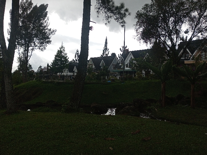 The image depicts an outdoor landscape in Sarwahi Mal., India, under an overcast sky. In the immediate foreground, dark green grass covers the ground, leading to a narrow water channel with reflective surface patches traversing horizontally across the lower mid-frame. Rocks and dark vegetation are visible along its banks. Two prominent tree trunks, dark and largely bare of lower branches, vertically frame the scene on the left and right. Beyond the water channel, a grassy hill rises, featuring a wooden railing along its crest. Above this elevation, a row of approximately five houses is visible, characterized by steep, dark-gabled roofs and light-colored facades, suggesting a European or chalet architectural style. Coniferous trees of varying heights are interspersed across the midground and background, and a solitary tall, slender pole stands upright near the houses. The sky above is heavily clouded. No individuals are visible, and no discernible actions or interactions are occurring.