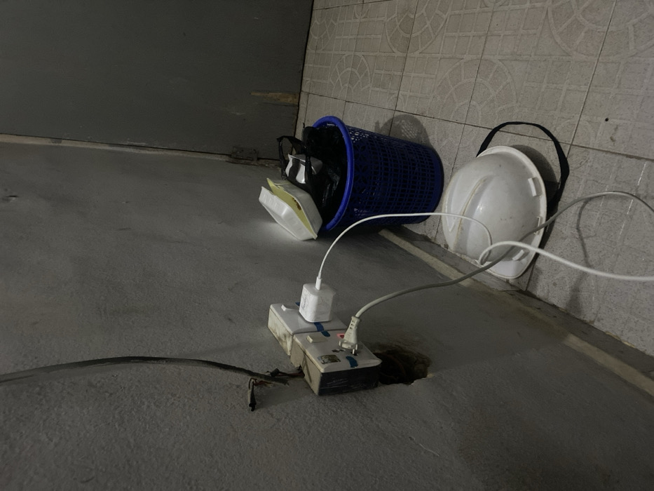 A blue plastic basket filled with trash rests near a white hard hat against a tiled wall. A white extension cord is plugged into a wall outlet, with a phone charger plugged into the cord. A black cord stretches across the concrete floor, frayed near the outlet. The scene is dimly lit.