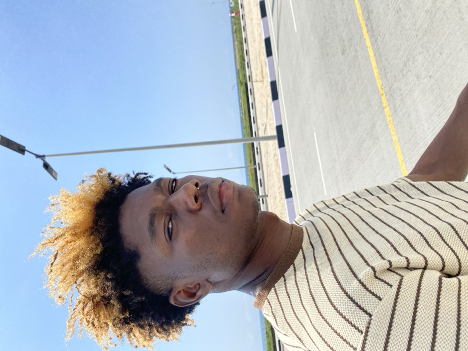 A young Black male is depicted in a daytime outdoor setting in Alaguntan, Nigeria. He is positioned on the left side of the frame, facing forward with a direct, neutral gaze towards the camera. He exhibits dark skin, a small silver septum piercing, and dark curly hair with the upper section bleached to a light blonde/orange hue, styled with a faded undercut on the sides. He is wearing a light-colored (cream or off-white) knitted short-sleeved shirt featuring thin horizontal brown stripes and a solid brown collar. The background consists of a wide, paved grey road with a solid yellow line on the asphalt and a black-and-white striped curb marking a median or shoulder. Beyond this, a sandy, undeveloped strip of land extends towards a large body of water, likely the ocean, visible under a clear blue sky on the horizon. Two tall, modern streetlights with flat, rectangular solar panels or fixtures are visible against the sky in the mid-ground.