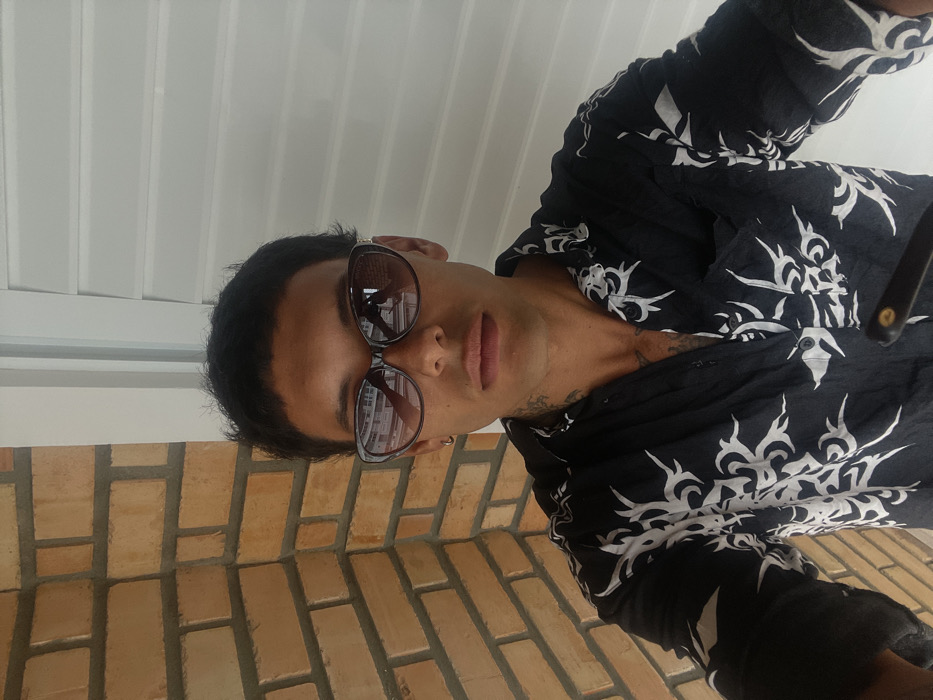 A man wearing sunglasses and a black button-down shirt with a white pattern looks down at the camera. He has short dark hair and is positioned outdoors, as indicated by the brick wall and ceiling visible in the background. The man has visible tattoos on his neck. The angle suggests the picture was taken from a low perspective, looking upward at him.