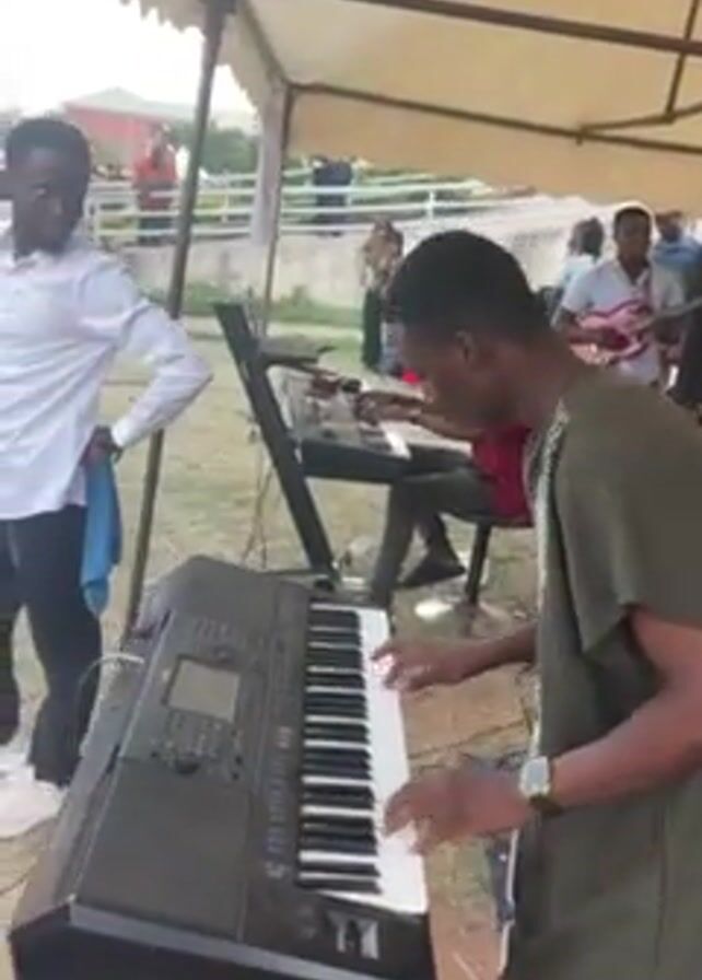 A man plays a keyboard in an outdoor setting. The man is standing, and wears a long-sleeved green shirt. The keyboard is black, on a black stand. Another man sits at a second keyboard behind and to the right of the first keyboard. Other people are standing around, some watching the keyboard players. A drum set is to the right. Everything is under a white tent. Beyond the tent, people can be seen standing on a grassy area. A white van and a red-roofed building are visible in the distance.