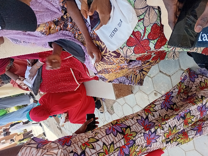 The scene is set outdoors or semi-outdoors in the city of Kwazailewa, Nigeria. The ground is paved with hexagonal tiles, primarily light brown and grey. A light-colored building structure or pillar is visible on the right. In the foreground, on the left, a person stands wearing a long, patterned dress featuring a light background with red, purple, yellow, and green leaf motifs. Their left hand holds a dark, rectangular object, possibly a smartphone. To the right, three individuals are seated on a light-colored concrete bench or ledge. 1. The leftmost seated person wears a full red head covering and a red garment, partially obscuring their face. They hold a light-colored object, potentially a book or document, in their hands. Their feet are visible in black and white sandals. 2. The central seated person wears a dark head covering and a red dress with white polka dots. They are actively writing on a document placed on a dark object. Dark bangles are visible on their right wrist. 3. The rightmost seated person wears a light purple patterned head covering over a multi-colored patterned dress. Their right hand is slightly raised, fingers curled. A black baseball cap is visible near their shoulder. Adjacent to them, another pair of hands holds a black smartphone, resting near a white fabric item with the "TECNO" logo. In the background, several additional individuals are visible, walking or standing. Some wear light-colored long robes, while one individual wears light blue trousers and a light shirt. A person in the far distance wears a yellow shirt. The overall environment suggests a public or institutional gathering area under daylight conditions.