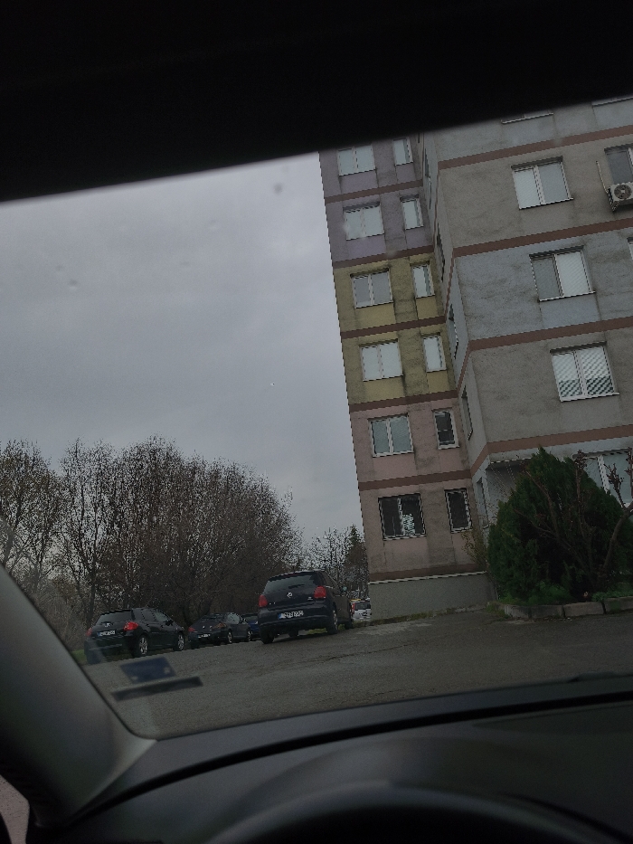 The image depicts a street scene in Bogomilovo, Bulgaria, viewed from inside a vehicle through a windshield displaying small water droplets. The sky is overcast and grey. On the right, a multi-story apartment building, at least seven stories high, features a facade with alternating horizontal sections of light purple, light yellow, and light grey, separated by reddish-brown bands. Multiple windows with white frames and patterned coverings are visible, along with an external air conditioning unit on an upper floor. A dark green, possibly coniferous, shrub is positioned at the base of the building on the right. In the mid-ground, a paved parking area contains several parked cars. A dark Volkswagen Polo hatchback with license plate CM 7927 BC is prominent, parked facing away from the viewer. Another dark hatchback is visible to its left. In the background, on the left, a dense cluster of leafless deciduous trees suggests late autumn or winter. No individuals are present. The bottom of the frame shows the dark dashboard and a segment of the steering wheel of the observer's vehicle.