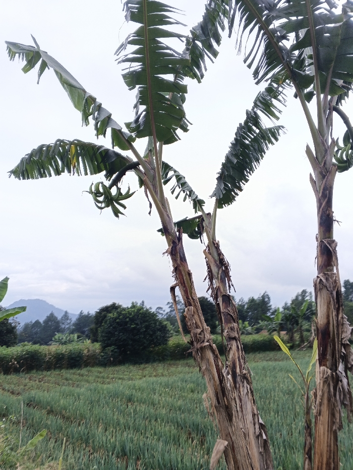 The scene depicts an agricultural landscape in São Félix do Xingu, Brazil, under an overcast sky. In the foreground, three prominent banana plant trunks, characterized by their peeling brown sheaths and large, partially torn green leaves, ascend from the right side of the frame. A cluster of small, undeveloped green bananas is visible hanging from one of the central plants. The midground is dominated by a broad, light green field of cultivated crops, likely a grain or vegetable, displaying subtle linear patterns suggesting rows. This field is bordered by a dense line of various green trees and shrubs. In the distant background, a dark green mountain range rises against a pale gray, uniformly overcast sky. No human figures or direct human activities are observable.