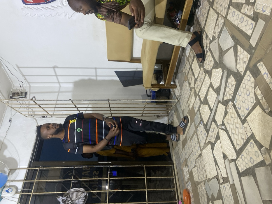 An indoor scene in Jos, Nigeria, depicts two men engaged in an interaction, with a third individual partially visible in the background