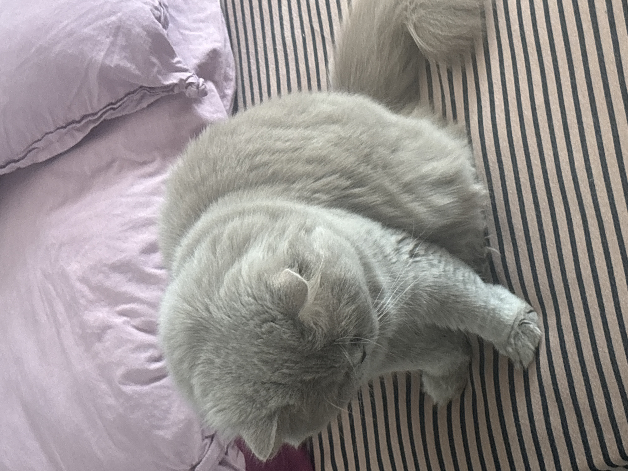 A light grey domestic cat, appearing to be a Scottish Fold based on its folded ears, is depicted seated on a bed in Strazhitsa, Bulgaria. The cat's head is bowed, facing downwards and slightly to its left, obscuring its facial features and eyes. Its dense, short-to-medium length fur is visible across its back, head, and tail. The cat is positioned on bedding featuring a pattern of alternating thin light beige/pink and dark grey/black horizontal stripes. Behind and to the upper left of the cat, a crumpled light lavender or pale purple pillowcase or sheet is visible, showing fabric folds. The scene is illuminated by ambient light, creating soft shadows. No other subjects or objects are present, and no active interactions are observable.